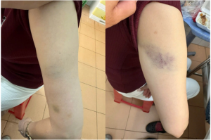 Tức giận, Lê và Lệ dùng tay chân đánh nhiều cái vào vùng đầu, mặt, ngực của bà Tuyết. Bà Tuyết cũng dùng dép đánh lại.