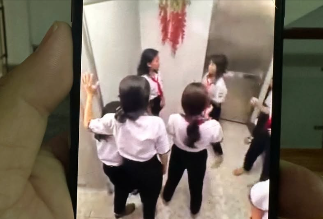 Nữ sinh bị quật ngã xuống nền, chỉ biết ôm đầu chịu đòn. Nhóm học sinh chỉ dừng lại khi một thầy giáo từ bên ngoài phòng vệ sinh lớn tiếng quát.
